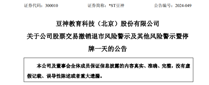 *ST豆神公告,公司股票将于2024年6月12日(星期三)开市起停牌1天,并于2024年6月13日(星期四)开市起复牌。*ST豆神股票将于2024年6月13日(星期四)开市起撤销退市风险警示及其他风险警示,股票简称由“*ST豆神”变更为“豆神教育”,股票代码仍为“300010”,股票交易的日涨跌幅限制不变,仍为20%。