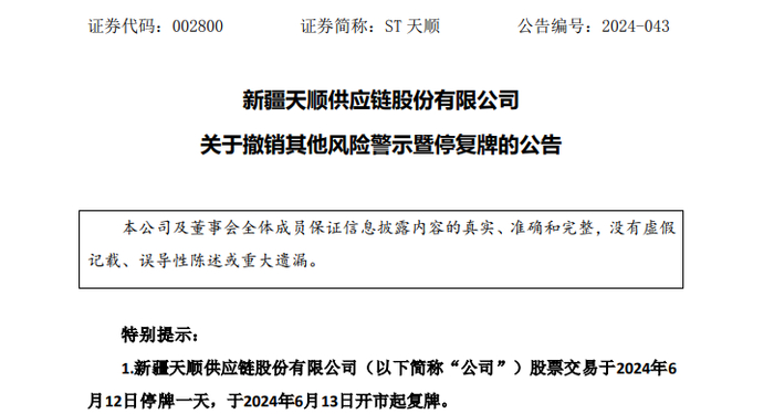 ST天顺公告,公司关于撤销其他风险警示的申请已获得深交所审核同意。根据相关规定,公司股票将于6月12日开市起停牌1天,并于6月13日开市起撤销其他风险警示并恢复交易,证券简称将由“ST天顺”变更为“天顺股份”,证券代码仍为“002800”。撤销其他风险警示后,公司股票交易日的涨跌幅限制由“5%”变更为“10%”。