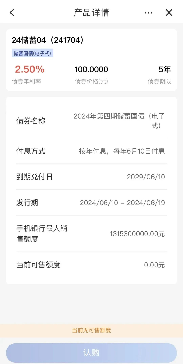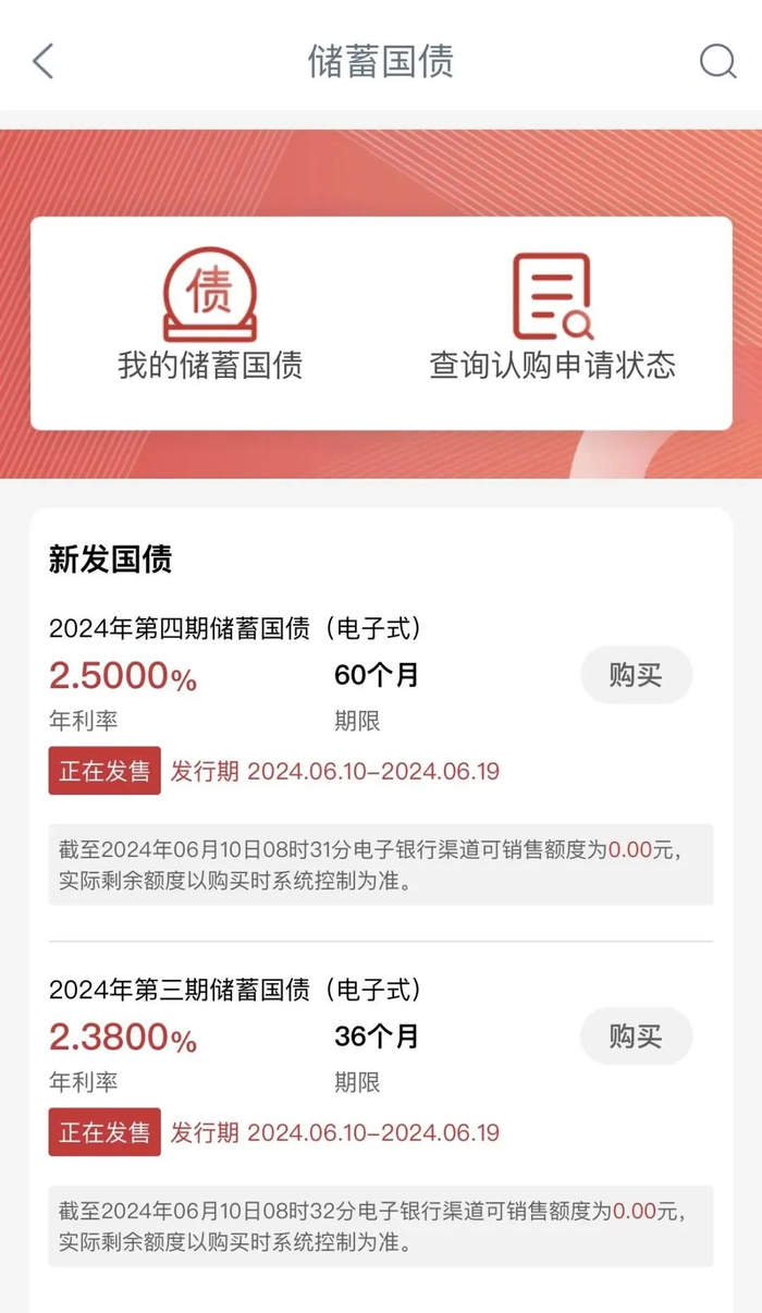记者注意到,工商银行手机APP显示,2024年第三期和第四期储蓄国债(电子式)的电子银行渠道可销售额度分别在开售后2分钟、1分钟内显示为0。记者在国债开售半小时后查询其他多家银行手机APP,同样显示2024年第三期和第四期储蓄国债(电子式)已无法在该渠道购买。