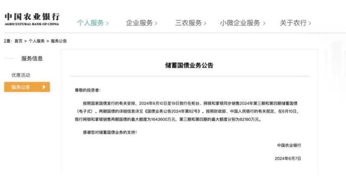 6月7日,农业银行等多家银行公告称,6月10日至19日,将售卖2024年第三期和第四期储蓄国债(电子式)。