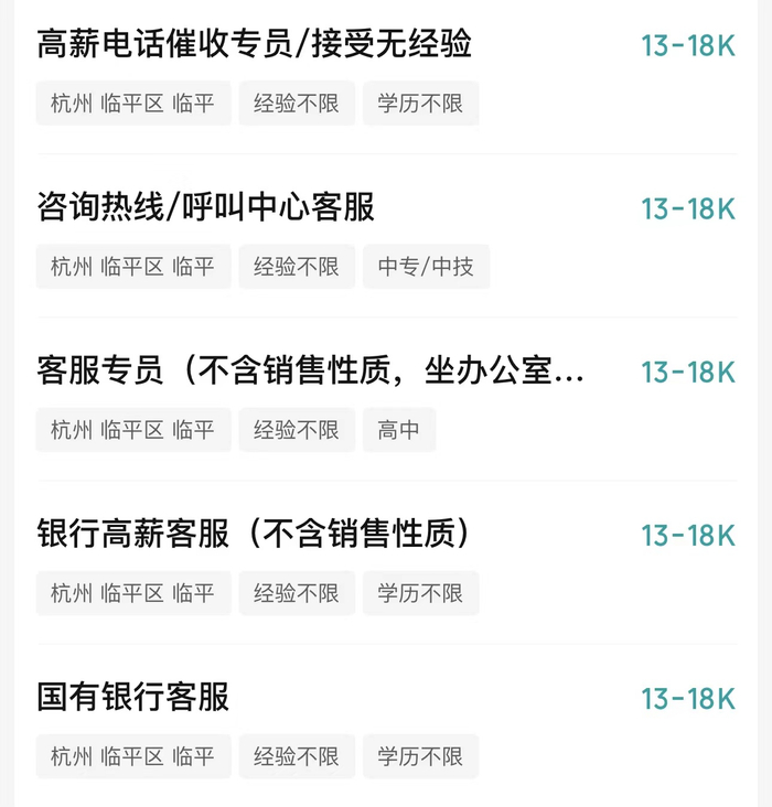 在招聘平台,银行催收岗随处可见。有的能一眼看出,如“银行信用卡催收专员”、“银行电催客服”;有的则比较隐晦,被写作“债务优化师”“调解员”“银行高薪客服”,需要点进去查看详情才能了解到工作内容。