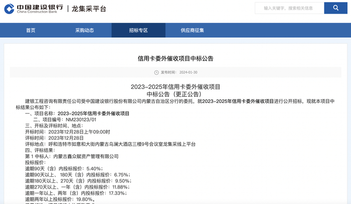 建设银行(601939.SH)内蒙古分行2023-2025年信用卡委外催收项目的中标情况为例,第一中标人对于逾期90天以内的信用卡资产包收取的服务费率为5.4%,91-180天为6.75%,181-270天为9.5%,逾期271天以上的服务费率则都超过了10%,两年以上的服务费率更是高达19.8%。这意味着,如果催收公司收回1000万元逾期两年以上的回款,从银行处拿到的佣金或高达198万元。