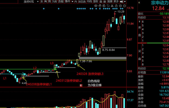 因此绿色水平线就非常关键。23年9月26日出现一个涨停,突破了绿色水平线。从12.55元开始,三条白色线段也像三节云梯,且第三条白色线段和绿色线在同一水平线上。