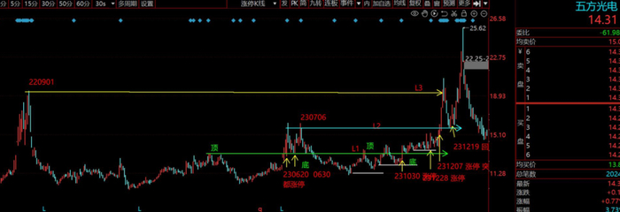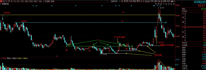 从这张图可见其有三条阻力线。L1绿色水平线上标注出了多个顶和底,被10月30日的涨停突破,而11月28日的涨停已经接近L2压力线。