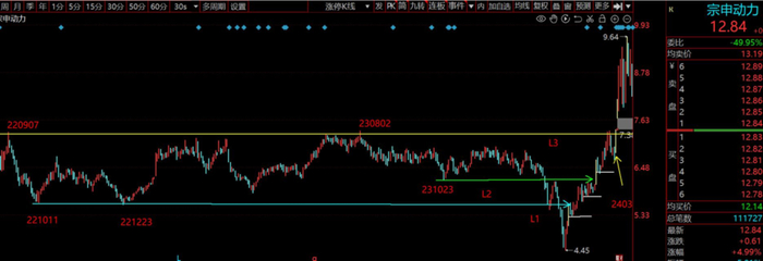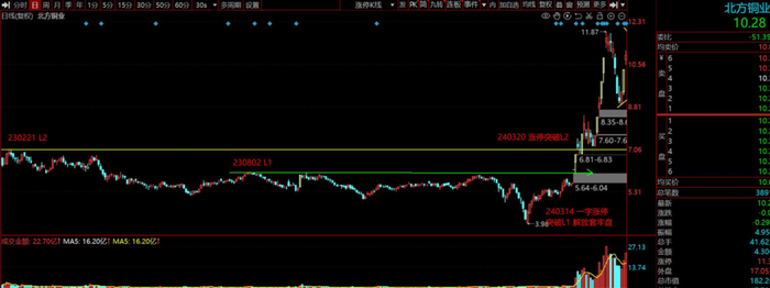 北方铜业在2024年3月14日一字涨停,且是跳空在2023年8月2日形成的绿色阻力线L1之上。