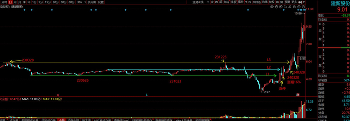 图中最右边23年3月28日是一个涨停,在此之前这个股票就有若干个涨停。建新股份同样画三条线,黄色线是长期的压力线,蓝色线是中短期的压力线,绿色线是支撑线。了解这些,再来看3月这几次涨停是不是也很熟悉?先涨停突破绿色线回调一下,再涨停突破蓝色线回调一下,最后涨停突破黄色线回调一下。