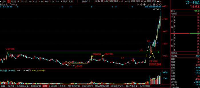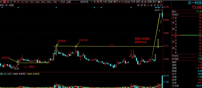 连续涨停后如果还想参与,怎么办?要看后续有无回调。文一科技23年1月4日绿色水平线是前期的一个左峰阻力线,所以其从一字板上去之后,很友好地又回调到了绿色水平线,并在1月30号再次回踩水平线后涨停。