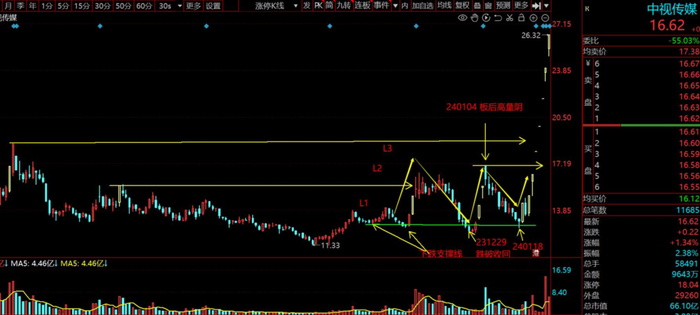 中视传媒1月18日后又出现了两次涨停,中间加一个阴线,这就是一个大阳反包。之后它连续一字板涨停没机会买,只能在它前面出现N字形走势之后回调得到了支撑,且基本面没问题,又和当时的风口相吻合,那可以在绿色水平线附近做一次试错,不然的话这种股票可能对普通投资者没有特别好的买点。