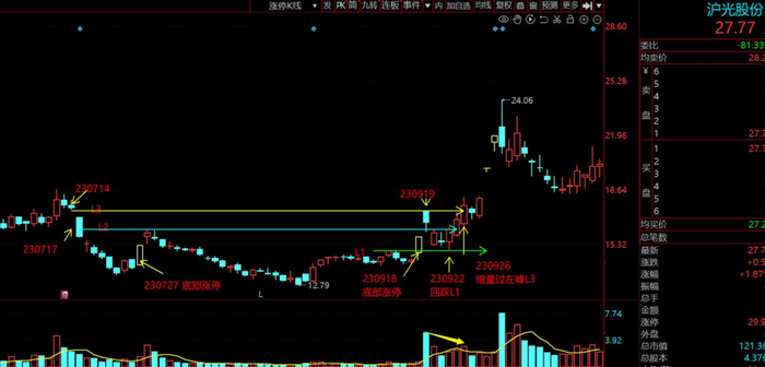 如果画阻力线,7月14号下影线的底部画水平线L3,恰好是9月19号放量阴线的顶部;7月27号高点画L2,可以看到9月18号涨停,9月19号就冲高回落了;把9月18号涨停之前的小平台画水平线L1,9月22日股价正好回踩L1。(关于如何精准画出阻力线和支撑线,训练营中有详细教学)