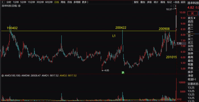其实19年4月12日浩丰科技也有个高开的阴线,在加上20年9月8日高点,这三点连起来是很明显的长期阻力位。
