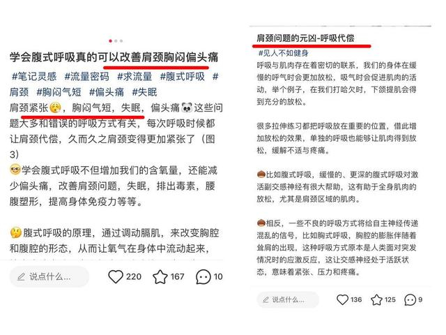 由于长期伏案工作、低头看手机,现代人的颈肩疼痛越发常见。但网络上也流传着一种说法,认为这种疼痛可能是错误的呼吸方式所致,每次用胸腔呼吸时都会让肩颈代偿,久而久之肩颈变得更加紧张了,斜方肌会变大,肩胛骨会疼痛,如果将呼吸方式改为腹式呼吸,肩颈酸痛会大大改善。但专家指出,目前并没有医学理论依据可以支撑这一观点。