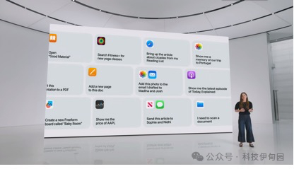 Apple Intelligence具有深刻影响力的另一种方式是它能够在您的应用程序中采取行动。采取行动的最大工具来源已经在您的口袋中,即您每天使用的应用程序。我们设计了Apple Intelligence,以便它可以利用这些工具并代表你执行任务。所以你可以说像“找出Joz上周与我分享的文件”,或者“给我看妈妈、Olivia和我的所有照片”,或者“播放我妻子前几天发送的播客”。我们正在设计Apple Intelligence,以便能够为您协调这些以及数百个其他操作,以便您可以在节省时间的同时完成更多工作。
