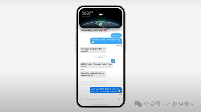 最后,当你没有Wi-Fi或蜂窝网络服务时,有一种新的保持联系的方式。我们使用了同样的突破性技术,通过卫星提供紧急SOS,现在为你带来了通过卫星发送信息的功能。