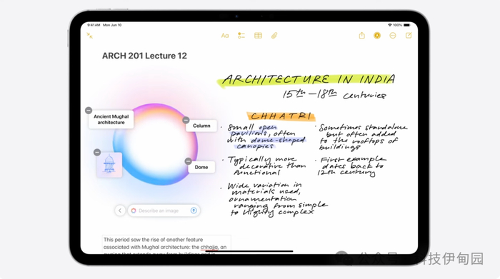 凭借深入理解并创建图像的能力,Apple Intelligence 解锁了很多美妙新体验,比如备忘录 app 中的全新工具,我们叫它 Image Wand Image Wand。它能将草图转换成精美图片,为笔记锦上添花,让它图文并茂。它在工具调板中就可以直接调用。如果建筑史课上你想做张更好的图,有了 Image Wand,用 Apple Pencil 把草图圈起来,就能在你的笔记中。