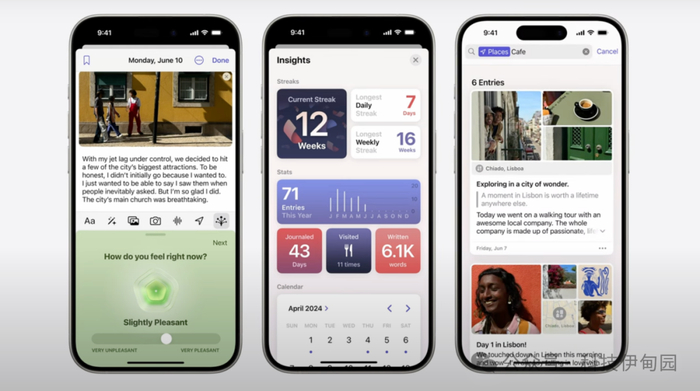 我们还对日记应用进行了更新,让你可以记录自己的心态,并借助洞察力视图来帮助你跟踪目标,该视图显示了你的写作连续性、日历和其他有趣的统计数据。现在,你还可以使用搜索功能快速找到你要找的过往记录。