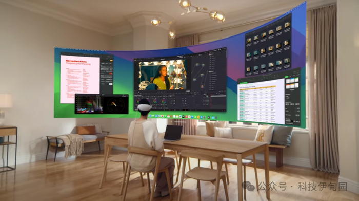 人们喜欢Mac虚拟显示,因为它让他们只需看一眼就能将Mac无线地带入Vision Pro,给他们提供了一个大型的私人和便携式4K显示屏。今年晚些时候,随着显示分辨率和尺寸的提升,体验将变得更加出色。它可以进一步扩展成一个环绕你的超宽显示屏,相当于两个4K显示器并排放置。无论你往哪里看,你的内容都保持清晰,这要归功于在Mac上执行的动态折页。