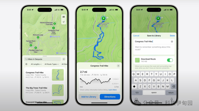 iOS 18还包括了一些对您日常使用的应用和功能的很棒的更新。让我们来一一了解它们,首先是地图。地图新增了带有详细小径网络和远足路线的地形图,包括所有63个美国国家公园,这些地图可以保存到您的手机上,并可以离线使用,具备逐向语音指导功能,并能创建您自己的远足路线。