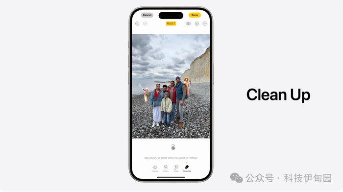 Apple Intelligence 还帮助我们充分利用与日俱增的照片图库资源。首先,我们升级了照片编辑功能。大家都遇到过这种情况,满心以为拍下了一张绝佳照片,但之后却发现美中不足。现在,全新的清除工具能识别背景中的干扰物体,让你能将之消除,但不会无意中改动照片的主体。