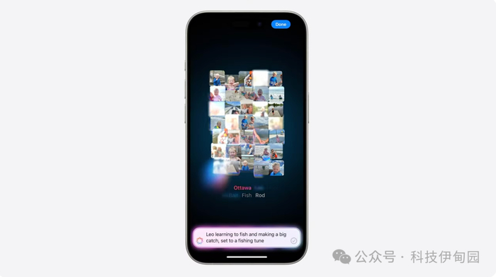 只要输入描述:学钓鱼。它就能解读出 这涉及到水、码头、鱼竿和船等。利用自身的语言和图像理解能力,Apple Intelligence 能挑出最佳照片和视频。然后根据识别出的照片、主题来分设章节,编织故事 并自成叙事架构编排成片。