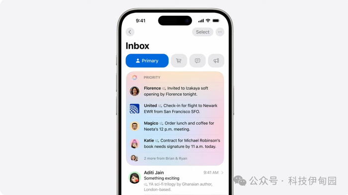 我们还将 Priority Messages 移至上方 Apple Intelligence 能读懂 你收到的邮件内容,判断哪封邮件最紧急,并将其置顶比如今天的晚餐邀请或是你当天下午航班的登机牌。这种对语言的深刻理解也融入了邮件之外的更多地方包括通知。 首先,和邮件一样,你的 Priority Notifications 会显示在叠放内容的顶端,让你可以一览需要注意的事项。同时,会显示这些通知的摘要 以便你能快速扫视 因此当有群聊消息弹出你在锁定屏幕上就能飞快看到 Savita 订好了房子 Lia 会提前到达。