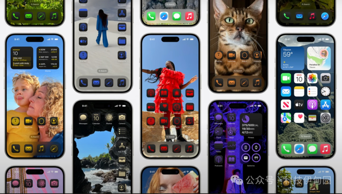 首先,让我们谈谈一组特性,这些特性为您提供了激动人心的新方式来进一步个性化你的iPhone,从你的主屏幕开始。你已经可以用你喜欢的壁纸、应用程序和小部件来定制你的主屏幕,让你的个性闪耀。现在,你的应用程序图标和小部件可以增添更多。让我来展示给你看。我有这张我喜欢的照片作为我的壁纸,现在当我解锁我的iPhone时,我可以继续欣赏它,因为我可以安排我的应用程序和小程序来完美地框住它。我可以全部选择它们,并轻松地将它们放置在屏幕底部右侧的码头上方,以便轻松访问,或者甚至放在一边。看看这个,当我们进入深色模式时,应用程序图标有了新的酷炫外观。让我们打开它。是不是很酷?现在,除了这种新的深色外观外,还有更多新的方式来调整它们的外观。我可以调出一个新自定义表,现在我可以用颜色给它们全部上色。iOS建议一个补充我壁纸的色调颜色。或者我可以选择我想要的任何其他颜色。现在它们真的很突出。如此简单就能创造出恰到好处的外观。无论你是喜欢经典外观还是想要变暗或用颜色来风格,都有很多可能性,让你的主屏幕真正成为你自己的。