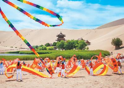 6月10日,在甘肃省敦煌市鸣沙山下,以敦煌市舞龙队为首的20个健身舞蹈队给游客们献上精彩演出。王斌银摄(人民视觉)
