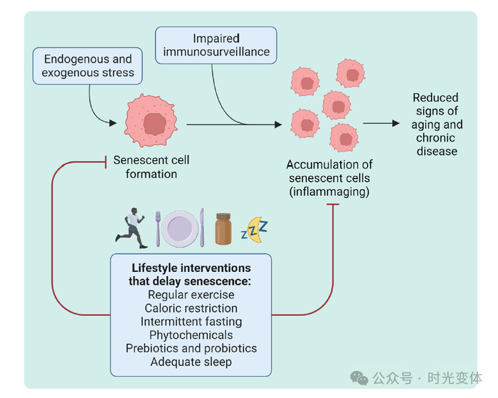 不同的生活方式干预措施,包括运动、营养、间歇性禁食、植物化学物、益生元和益生菌以及充足的睡眠,可以对模型生物和人类产生抗衰老的作用。尽管这些干预措施广泛有益,但衰老细胞减少代表了一种新的作用机制,解释了这些干预措施的效果。生活方式因素对衰老的影响相当复杂,可能会被抵消或变得有害,取决于其强度和频率。此外,不健康的生活方式包括久坐不动、过量饮酒、吸烟、缺乏睡眠和阳光暴露以及慢性压力,可能抵消其他干预措施对衰老的有益影响。因此,应更多关注产生有益效果的方式及其与抗衰老化合物和其他生活方式习惯的相互作用。