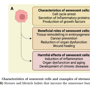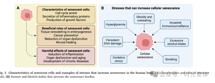 细胞衰老是细胞周期停滞的一种状态,即使在有利的生长条件下,细胞也会停止增殖。各种内源性和外源性的压力可以诱导衰老细胞的产生,包括端粒功能障碍、持续的DNA损伤、高血糖、肥胖和吸烟等。细胞衰老涉及胚胎发生、伤口愈合和癌症预防。在胚胎发育期间,衰老细胞参与胚胎生长和组织模式的形成。当身体受到伤口时,衰老细胞释放生长因子,促进细胞生长和组织愈合。衰老细胞释放的促炎性细胞因子也作为干细胞激活和免疫细胞募集的信号。持续的DNA损伤也可能导致细胞进入衰老,从而减少器官功能障碍和癌症风险。