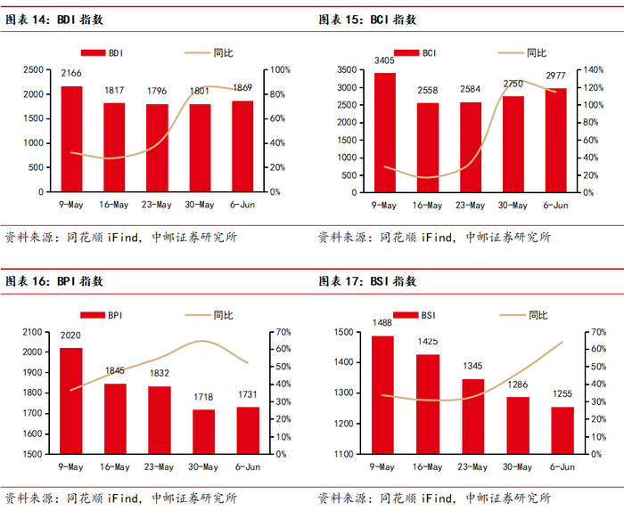 集运指数方面,本周SCFI综合指数报3185点,环比涨4.6%,CCFI指数报1593点,环比涨6.5%。分航线看,欧洲航线SCFI指数报3949点,环比涨5.6%,地中海航线SCFI指数报4784点,环比涨1.4%,美西航线SCFI指数报6209点,环比涨0.7%,美东航线SCFI指数报7447点,环比涨3.3%。油运方面,本周BDTI指数报1267点,环比涨2.1%,BCTI指数报858点,环比跌16.1%。干散货方面,本周BDI指数报1852点,环比涨3.6%,其中BCI、BPI、BSI指数分别报2945点、1702点、1258点。