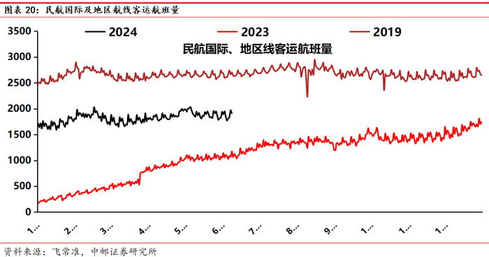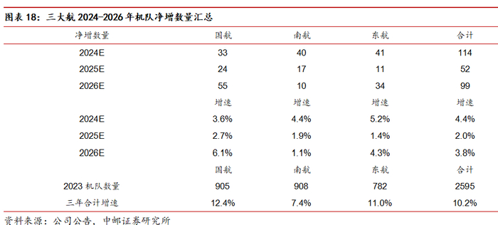 行业供需层面,根据三大航在年报中更新的2024-2026年机队引进规划,2024-2026年国航、南航、东航合计飞机增量分别为114架、52架、99架,增速分别为4.4%、2.0%、3.8%,三年年化增速仅为3.3%。结合当前我国航司尚未接收的波音、空客飞机订单情况,波音、空客在手订单数量及其交付能力,我们认为未来三年行业供给约束仍然较强。