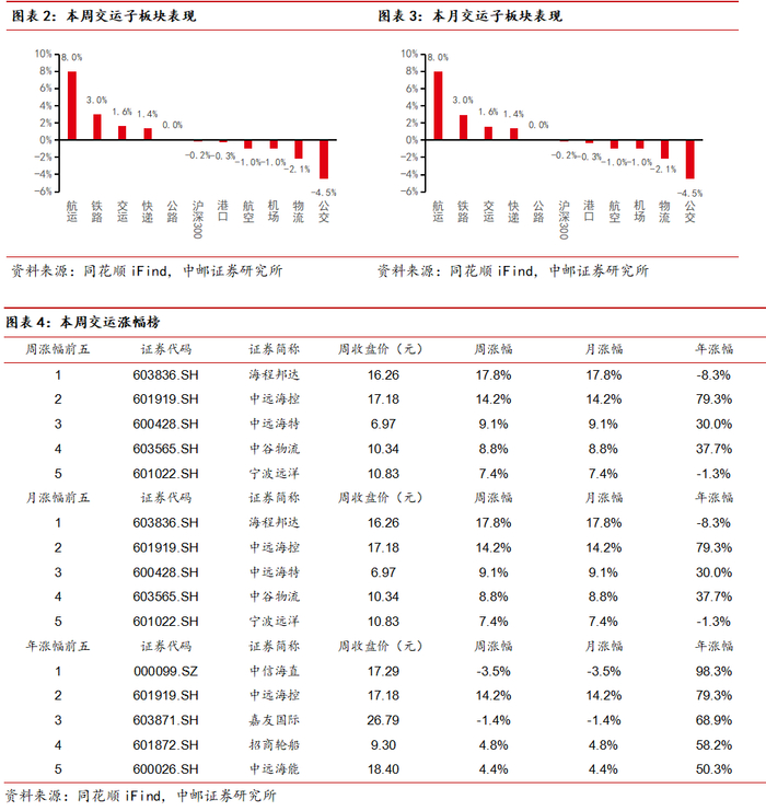 本周交运各子板块表现分化,航运板块受益于运价提振大幅上涨,但物流小市值个股整体下跌。