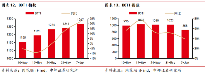 油运方面,本周BDTI指数报1267点,环比涨2.1%,BCTI指数报858点,环比跌16.1%。