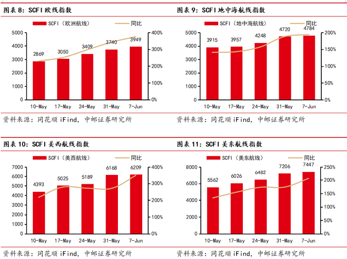 分航线看,欧洲航线SCFI指数报3949点,环比涨5.6%,地中海航线SCFI指数报4784点,环比涨1.4%,美西航线SCFI指数报6209点,环比涨0.7%,美东航线SCFI指数报7447点,环比涨3.3%。