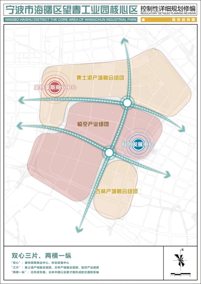 功能定位为浙江省高新技术产业园、宁波市产城融合示范区,规划构建“双心三片、两横一纵”的空间结构。