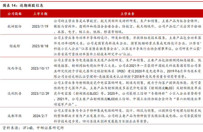 2)军工新趋势,建议关注军工新技术、新产品、新市场,产业链相关标的包括国睿科技、烽火电子、高华科技、中科海讯、海格通信、华秦科技、航天南湖、芯动联科、航天彩虹、臻镭科技、铖昌科技、三角防务、润贝航科、联创光电等。