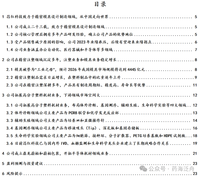 公司主要处于生命科学实验产业链上游,为中下游客户提供相关器械。生命科学实验的塑料耗材下游主要是生命科学开展方,如高等院校、科研院所、生物医药企业、第三方检测机构和生物样本存储服务机构等用户构成,集中度较低。中游主要指各类生命科学一次性耗材的生产商,主要用于细胞培养和收获、生物实验移液、溶液过滤和分析、贮存等。上游则主要是包括供聚丙烯、聚乙烯、聚苯乙烯等原辅材料的供应商、模具供应商、注塑机等设备供应商和提供第三方服务(如灭菌)的供应商。昌红科技目前主要处于生命科学实验产业链上游,为中下游客户提供相关器械。