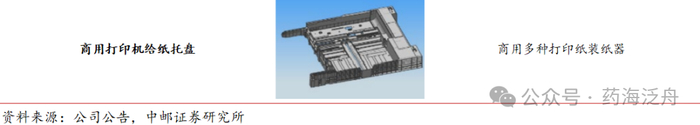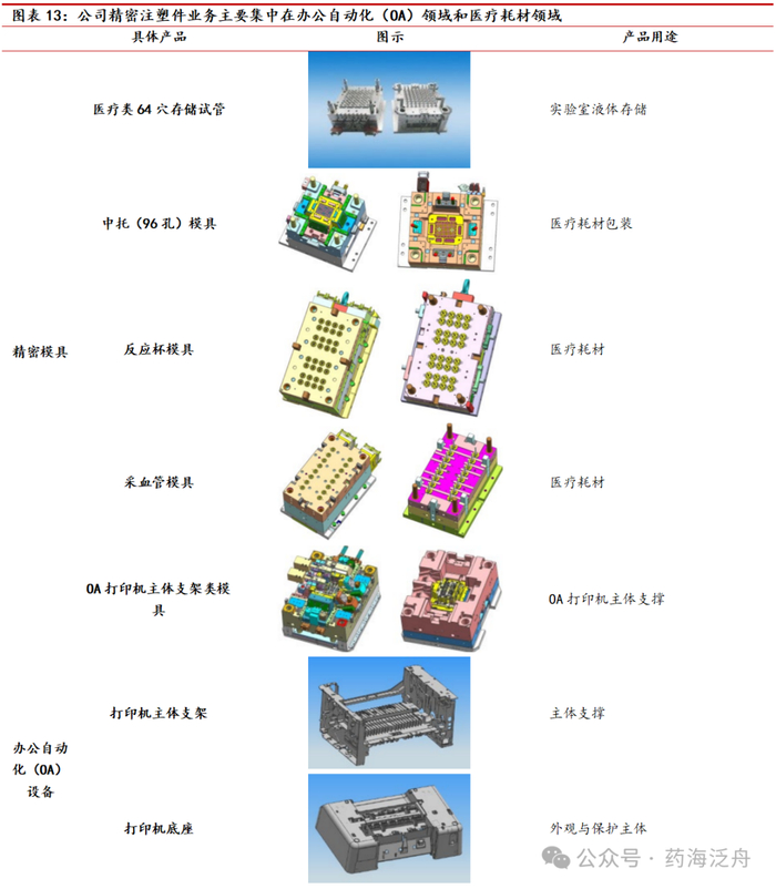 公司精密注塑件业务主要集中在办公自动化(OA)领域和医疗耗材领域。公司在精密模具方面的积累赋能了精密注塑产品的业务发展,现阶段公司精密注塑件业务主要集中在办公自动化(OA)领域和医疗耗材领域。其中在OA领域,公司主要为客户提供包括打印机、复印机的核心精密结构件、引擎部件以及整机组装等专业机械设计和整体智能制造集成解决方案。