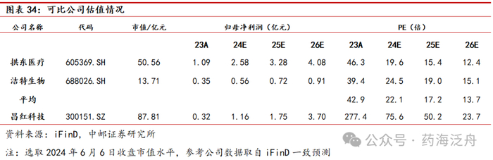 与公司业务相似性高的同行业公司有同样在医疗耗材CDMO领域的拱东医疗(IVD定制化及医用一次性塑料耗材)、同样为实验室生物塑料耗材业务的洁特生物(实验室生物一次性塑料耗材)作为可比公司。