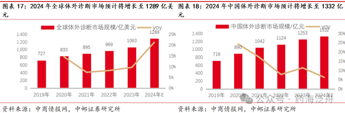 2024年我国体外诊断市场规模有望增长至1332亿元。中商产业研究院最新发布的《2024-2029年中国体外诊断行业市场发展监测及投资战略咨询报告》明确指出,2023年全球体外诊断市场规模已攀升至1063亿美元,同比增长9.7%,预计将在2024年进一步扩大至1289亿美元。我国体外诊断行业的起步时间较晚,但其发展速度却相当迅猛,2023年我国体外诊断市场规模已达到1253亿元,同比增长12.6%。考虑到我国经济的稳步发展、人口老龄化的日益加剧,以及人均医疗开支的不断攀升等多重因素综合影响,国内体外诊断市场规模将保持增长态势。中商产业研究院预测,2024年我国体外诊断市场规模有望增长至1332亿元。