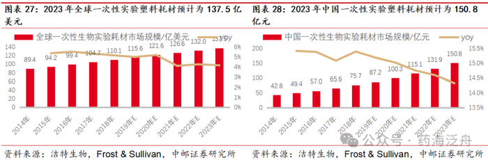 预计2023年中国生物实验室一次性塑料耗材市场有望达到150.8亿元。根据沙利文公司的统计预测数据显示,2018年全球生物实验室一次性塑料耗材市场规模为110.1亿美元,2014年-2018年复合增长率为5.3%,预计2023年有望达到137.5亿美元。中国生物实验室一次性塑料耗材市场从2014年的42.8亿元增长至2018年的75.7亿元,2014-2018年复合增长率15.3%,预计2023年中国生物实验室一次性塑料耗材市场规模有望增长至150.8亿元。