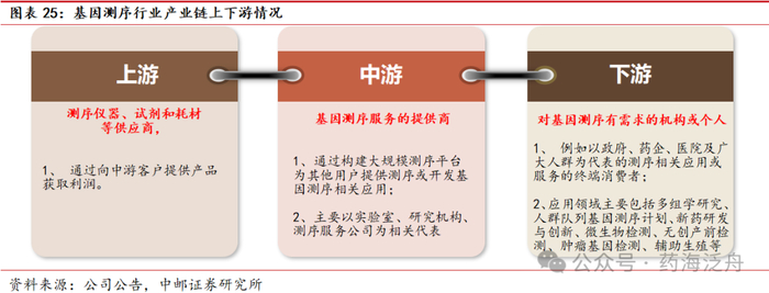 公司处于基因测序产业链上游,通过向中游客户提供产品获取利润。基因测序产业链的下游主要是对基因测序有需求的机构或个人,例如以政府、药企、医院及广大人群为代表的测序相关应用或服务的终端消费者,应用领域主要包括多组学研究、人群队列基因测序计划、新药研发与创新、微生物检测、无创产前检测、肿瘤基因检测、辅助生殖等;产业链的中游是基因测序服务的提供商,通过构建大规模测序平台为其他用户提供测序或开发基因测序相关应用,主要以实验室、研究机构、测序服务公司为相关代表;上游则是测序仪器、试剂和耗材等供应商,通过向中游客户提供产品获取利润。