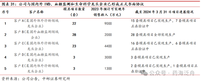 公司与国内外行业领军企业已形成正式书面协议。截至2024年3月31日,公司与国内外行业领军企业已形成正式书面协议并已经开始研发有79套模具,其中64套已经实现生产,14套模具项目正在验证中。中国作为国际IVD龙头全球布局的重要市场,战略地位将持续提升,公司作为国际客户产能向国内转移的重要承接方,以及国内客户产品升级的重要合作方,订单有望加速兑现。