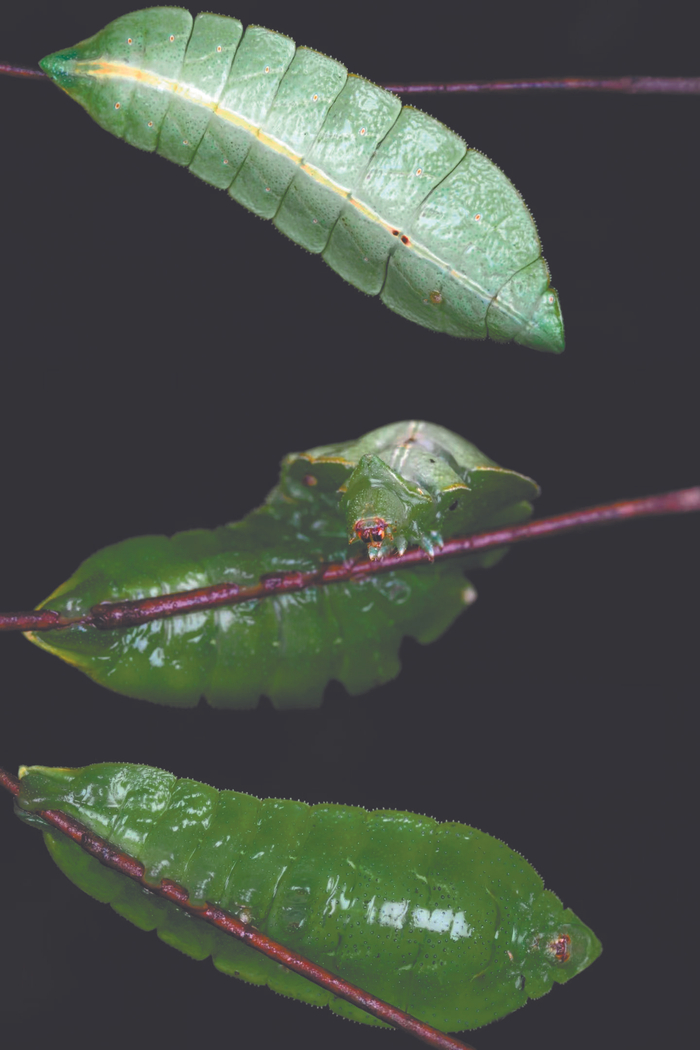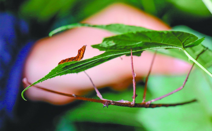 竹节虫 你猜猜,这张图上面有几只虫啊?很多人会说,这不就是一只虫趴在绿叶和枯枝上面吗?其实,绿叶下面的那截枯枝也是一种昆虫——竹节虫。 竹节虫形状细长似竹节,行动迟缓,白天静伏在树枝上,晚上出来活动,取食植物的叶子充饥。 技能:伪装,利用形态上的伪装和身上的保护色来躲避天敌。