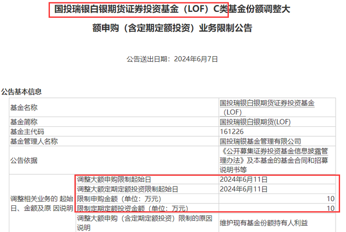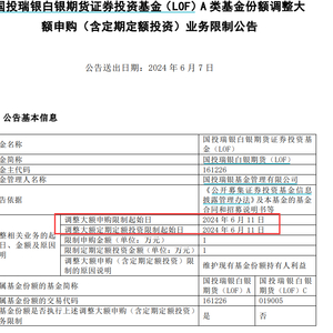据国投瑞银基金公告,维护现有基金份额持有人利益,自6月11日起,旗下国投瑞银白银期货证券投资基金(LOF)(简称“国投瑞银白银期货”)中A类份额申购限额调整为1万元;C类份额申购限额调整为10万元。