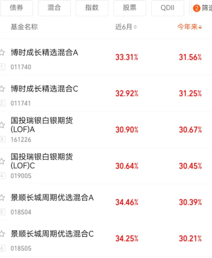 Wind数据显示,截至6月7日,今年以来国投瑞银白银期货A单位净值上涨30.67%,在商品类基金同期涨幅榜中暂居榜首(剔除年内成立的产品,仅统计主代码,下同),在全市场基金中位列第二。
