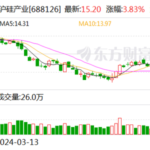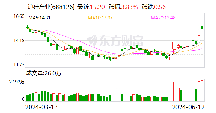 受此消息影响,今日(6月12日)早盘,沪硅产业股价高开,截至《科创板日报》记者发稿,该公司股价一度涨超6%,盘中报15.55元/股,总市值在415亿元左右。