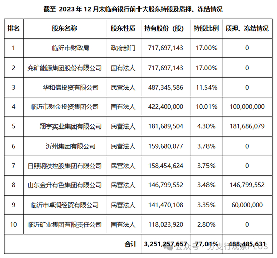 相关财报披露,截至2023年9月末,临商银行所有者权益111.85亿元,实收资本为42.21亿元。临沂市财政局和兖矿能源集团股份有限公司并列为该行第一大股东,持股均为717697143股(持股比例为17.00%),其余前八大股东及持股情况分别是华和信投资有限公司持股487345586股(持股比例为11.54%)、临沂市财金投资集团有限公司持股422400000股(持股比例为10.01%)、翔宇实业集团有限公司持股181689504股(持股比例为4.30%)、沂州集团有限公司持股159680077股(持股比例为3.78%)、日照钢铁控股集团有限公司持股158454624股(持股比例为3.75%)、山东金升有色集团有限公司持股146799552股(持股比例为3.48%)、临沂市卓润经贸有限公司持股141470108股(持股比例为3.35%)、临沂矿业集团有限责任公司持股118023920股(持股比例为2.80%),前十大股东累计持股3251257657股,持股比例合计77.01%。其中临沂财金投资集团、翔宇实业集团、山东金升有色集团公司、临沂市卓润经贸有限公司分别出质股权100000000股、181686079股、146799552股、6000万股,出质股权合计488485631股。此外,临沂财源钢铁有限公司所持临商银行股权1475.2989万股,业已于2024年1月23日质押给日照银行临沂分行。
