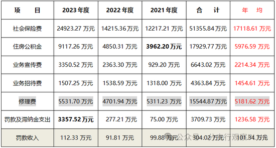 从上图来看,社保保险费增长幅度较大,2021年仅为12217.21万元,2022年增加至14215.36万元,2023年暴涨至24923.27万元;住房公积金增长幅度更大,2021年仅为3962.20万元,2022年增加至4850.31万元,2023年暴增至9117.26万元;业务宣传费则从2021年的929.20万元增至2023年3350.52万元;修理费变动不大,年均5000万元左右;2023年,临商银行罚款及滞纳金支出3357.52万元,领先山东省内城商行。