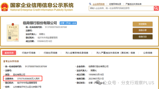 2024年5月15日,国家金融监督管理总局山东监管局批复,同意临商银行股份有限公司注册资本由人民币4221300486元变更为人民币4262900486元。截至2024年6月10日,临商银行在市场监督局登记的注册资本仅379379.0086万元,与前述批复初始金额存在4.275亿元的差额,这一情况值得进一步关注。