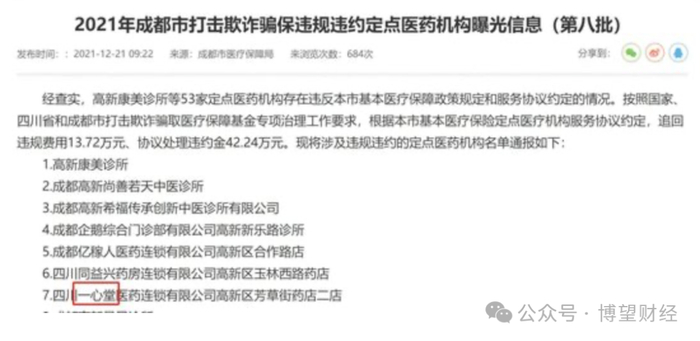 梳理媒体报道,全国各地的医保局近年在分批次通报抓到的典型违规案例中,一心堂多次“榜上有名”,从成都、宜宾、眉山、攀枝花,到自贡、盐城……,可谓横跨多省市,“位列”属地医保局曝光的欺诈骗保名单之中。